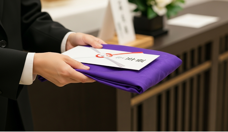 不祝儀袋が汚れたり、角が折れたりするのを防ぐため、必ず「袱紗(ふくさ)」に包んで持参します。