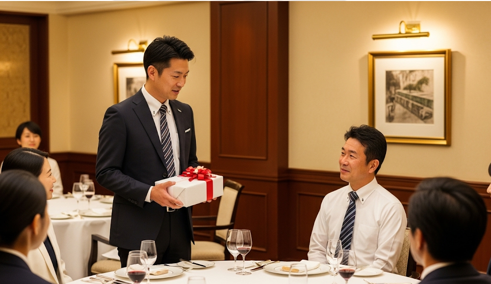 昇進祝いの食事会でプレゼントを手渡す際には、短いながらも心のこもった挨拶を添えることで、お祝いの気持ちがより一層深く伝わります。