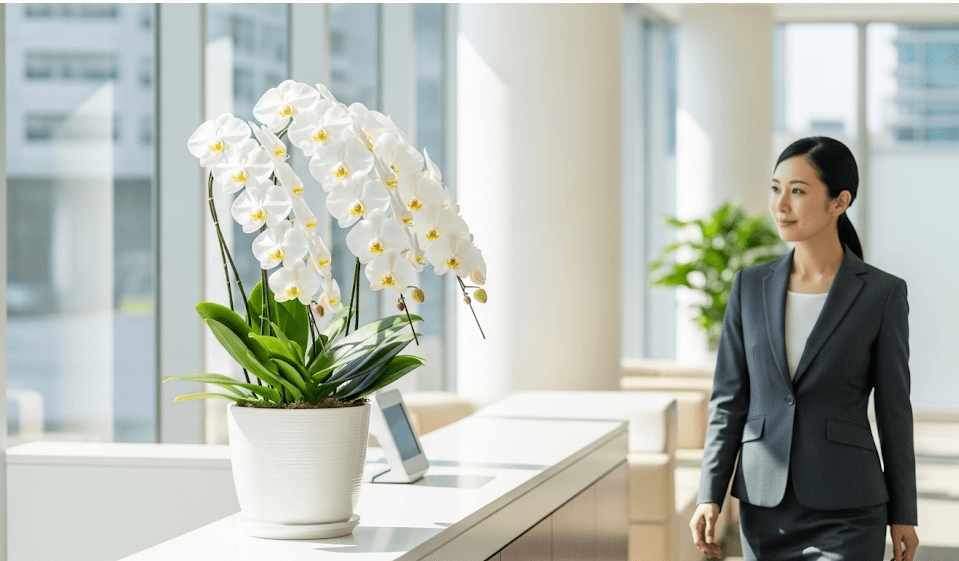 胡蝶蘭は、来客や他の社員の目にも触れ、昇進した本人のステータスを高めると同時に、会社全体でお祝いしているという雰囲気を醸成します。