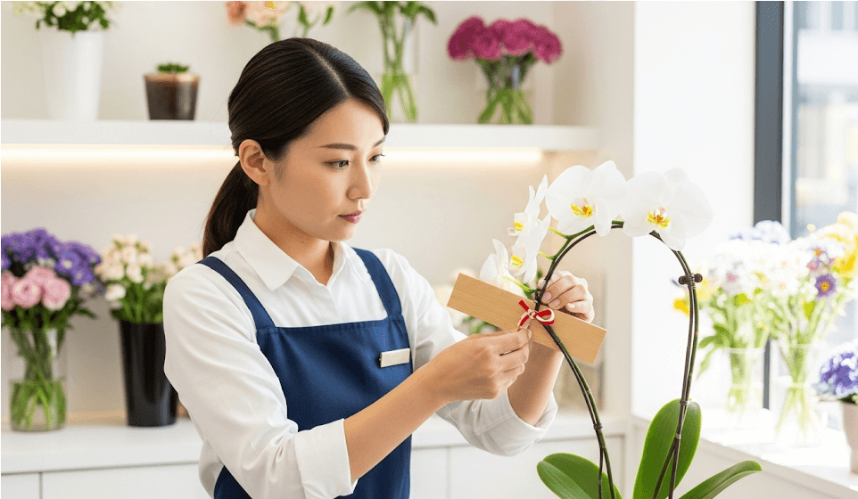 法人向けの胡蝶蘭に欠かせないのが「立て札」です。これは、花束でいうところのメッセージカードにあたり、「誰から誰へ、何のお祝いか」を明記するためのものです。